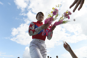 LVR公式アンバサダーの鈴木元騎手が「みんなで力を合わせて頑張ってください」とエールを送ると、地方競馬における女性騎手最多勝記録を更新中の宮下騎手は「魅力あるレースを見せます」と笑った。また先9月17日、地方通算700勝を達成した別府騎手はその4日前に宮川実騎手(高知)と入籍。「幸せです。LVR3連覇を目指して頑張ります」と話すと、騎手同士の夫婦としても先輩にあたる宮下騎手から「レース中は夫婦であることを忘れて、家庭では競馬を忘れるようにするのが円満の秘訣」とアドバイスを受けた。木之前騎手は競馬場に着いた頃からいつも以上にはつらつとした笑顔。「今日は調子がいいので、やれそうな気がします。今年はLVRで勝ちたいです」と、未勝利だった昨年のリベンジを誓った。