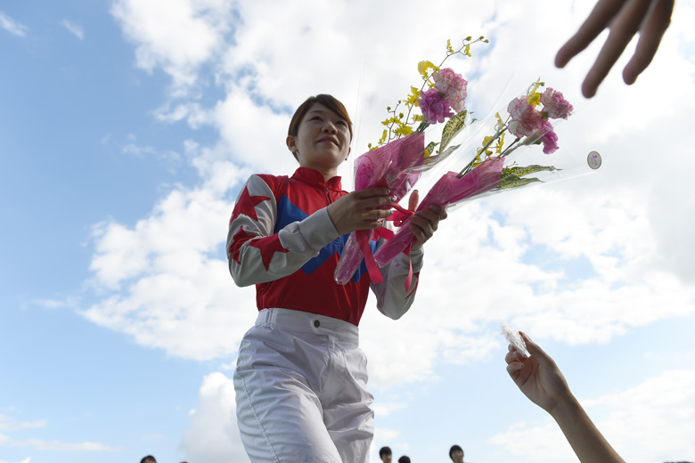 一方、木之前騎手は「1戦目はそんなことなかったのですが、1コーナーくらいから砂で前が見えづらくなってしまって」と焦っていた。勝負どころから宮下騎手は「前が団子状態で進路に迷った」といい、直線入口では前の2頭の間を突いた。そこから脚を伸ばしたが、岡村騎手に3/4馬身届かず2着。「直線は外に出そうかとも思ったのですが……そしたら結果が変わっていたかなぁ!?」と肩を落とした。木之前騎手はここでもコーナーで内を通って5着。別府騎手はゴール前、差し脚を伸ばすも6着で「3人しかいない分、女性騎手に先着できるかどうかで大きく変わりますよね」と女子限定ポイントを意識していた。