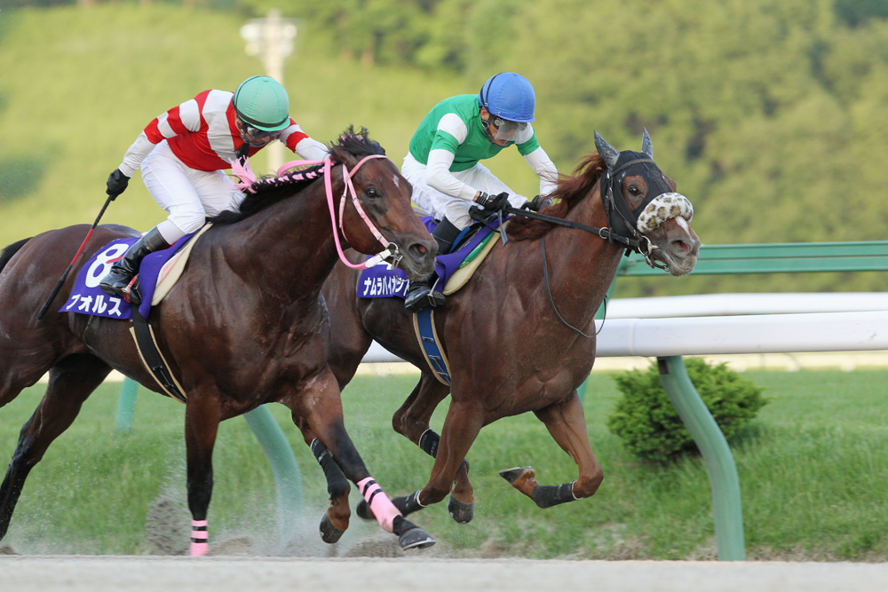 レースはフォルスとコウセンの2頭がガンガン飛ばしてハイラップ(11.7-10.7-11.2-12.4-13.1)を刻む。誰もがビックリ、どこからきたのか、何番がきたのかというほどゴールでは衝撃。ダート1000メートルで最後方からの追い込みを決めたナムラバイオレットが驚異の瞬発力で見事な勝利。