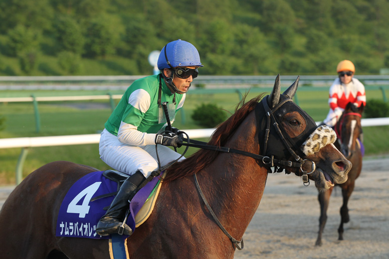 山の上にある盛岡競馬場。6月に入ってすぐというのに気温は29度を超えたレース当日。18時になっても気温は下がることなく、パドックでは馬たちが発汗し、したたり落ちるほどの汗。それを見るファンもパドックを周回させる厩務員も汗。この時期に、これほど暑くなるのは珍しい。そのなかで行われたレースも予想外の展開となった。パドックで12頭の中でいちばん発汗していたのが勝ち馬のナムラバイオレット。