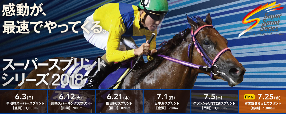 今年で8年目を迎える、競走距離1000メートル以下のレースのみで構成されるシリーズ競走、『スーパースプリントシリーズ(略称:SSS)』。トライアル5戦、ファイナルの習志野きらっとスプリントという構図は変わりませんが、今年は金沢の日本海スプリントがトライアルの対象レースとなっております。