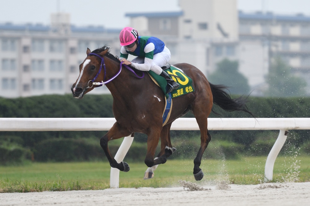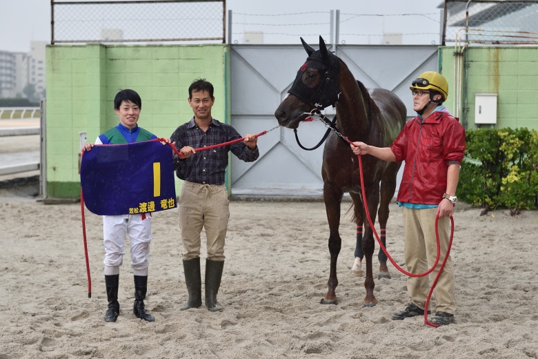 この日は全体的に時計が速めの馬場コンディション。それも味方につけたのか、渡邊騎手の独走は最後まで続き、ゴール地点では2着に4馬身差をつけた。レース後は「スタートして何もしなくても逃げられました」と渡邊騎手は満面の笑み。「次のレースで乗るのは、全休日に弥富トレセンへ攻め馬に行ったときにたまたま乗せてもらった馬」とのことで、「2勝して1位通過を目指します」と力強く話した。
