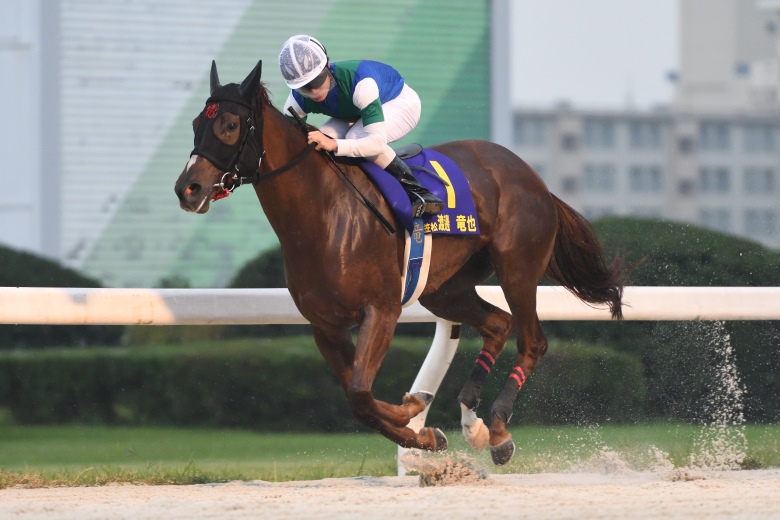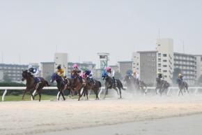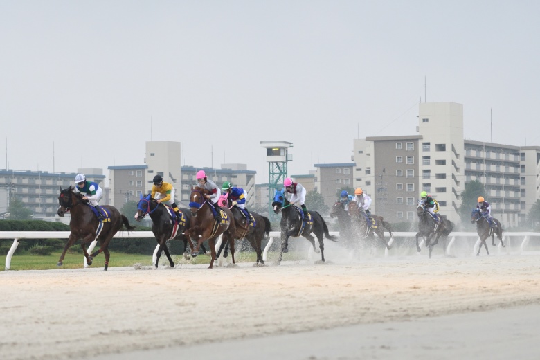 その渡邊騎手は大外枠からのスタートだったが、すぐに先手を取り切って、後続にすこし差をつけての単騎逃げ。2番手には加藤祥太騎手(JRA)がつけ、富田暁騎手(JRA)も差なく続いたが、その後ろはやや離れて一団という形になった。