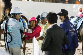続く3着は、2着から5馬身差と離れたが、最後の直線だけで差を詰めてきた落合玄太騎手(北海道)が入線。「前に行きたくても行けなかったのですが、3コーナーあたりからジワジワと伸びてくれました。3着でも着実にポイントを稼げたので良かったです」と、落合騎手は笑顔を見せていた。落合騎手は前半のレースで2回騎乗して、初の川崎となる第1レースで勝利。門別では「たまに左回りで調教をすることがある程度」とのことで、このコース経験が大きな援軍になったようだ。