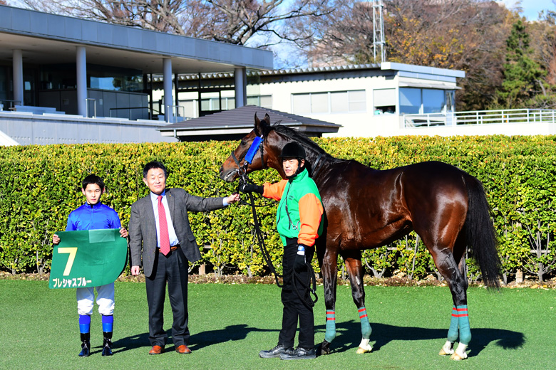 気温は低いものの、空は青く晴れ渡った中山競馬場で、まずは芝2000メートルを舞台に第1戦がスタート。単勝1番人気には服部寿希騎手(JRA)のプレシャスブルーが支持された。近2戦がともに2着という成績は群を抜いて良いのだが、それでも単勝オッズが2.5倍にとどまったのは、このレースが普段とは違う面があるとファンが認識しているからかもしれない。