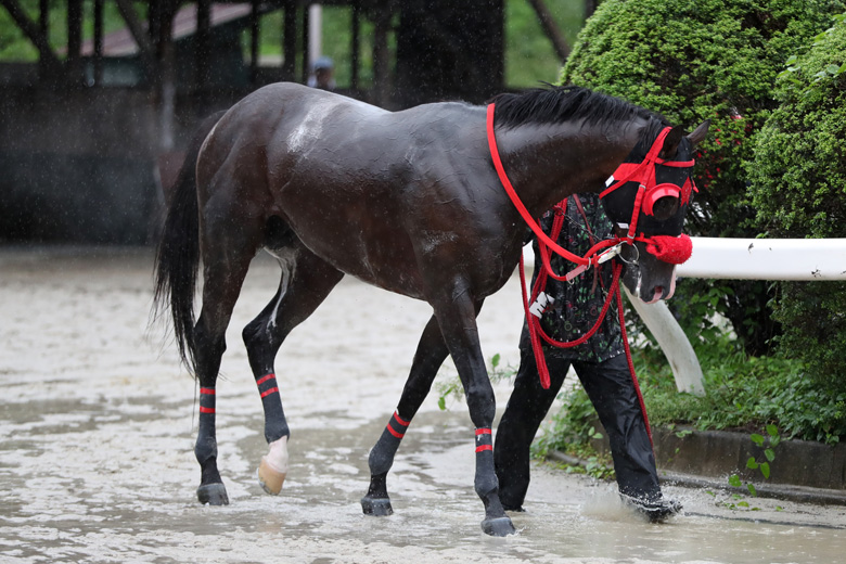 この日の笠松競馬場は、時間を追うごとに雨が強くなる空模様。当初は稍重だった馬場状態は第6レースから重になり、砂が薄い外ラチ沿いには水たまりができていた。