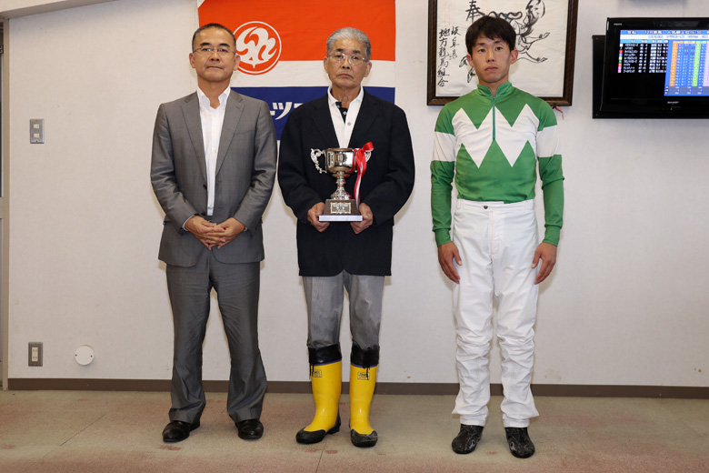 メモリージルバはこれで重賞3勝目。そのすべてが笠松で挙げたものだ。「笠松だけで成績がいいのは不思議ですね。でも最近はもうひと息という結果が続いていたので、今日は勝ててよかったです」と、雨天のためにスタンド内に場所を移して行われた表彰式のあと、手綱を取った友森翔太郎騎手は笑顔を見せた。