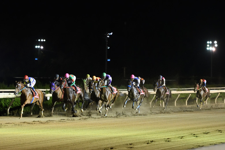 主導権を握ったのは、内めの3番枠に入ったサウスウインド。重賞5勝すべての手綱をとっている高知の赤岡修次騎手が押して先頭に立った。エイシンニシパがぴたりと2番手につけ、内の3番手にはクイントゥープル。中央時代は後方からレースを進めることが多かったタガノゴールドも外め4番手にとりついた。