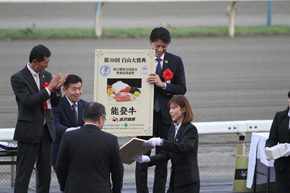 地方競馬全国協会理事長賞の副賞として畜産品が贈呈された