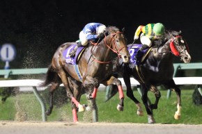 直線で抜け出したのは、金沢所属として岐阜金賞(笠松)を制しての転入初戦だったニューホープだったが、これをゴール前でハナ差とらえたのが、黒潮盃(大井)7着からこれまた転入初戦のヤマショウブラックだった。