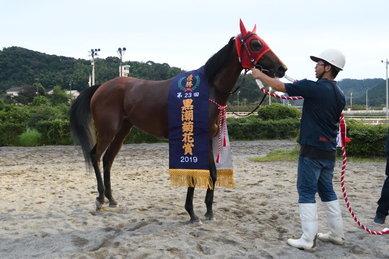勝ったのは、地元高知のアルネゴー。縦長の隊列となって、いつものように後方2番手を追走。向正面からロングスパートでまくって出ると、直線半ばでは先頭に立ち、最後は手綱を抑える余裕の勝利となった。黒潮皐月賞を制したあと骨折休養があり、中1週の厳しいローテーションになる黒潮菊花賞は回避。ここに狙いを定めての快勝だった。