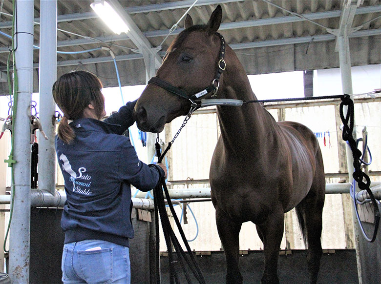 【佐藤里】競馬はもちろんギャンブルという一面もあるんですけど、お客様に“見せるスポーツ”というのが厩舎としての考えなので、馬だけでなく厩務員の身だしなみにも気をつけるようにしています。引き綱を肩に掛けないとか、シャツを外に出したりだらしない格好をしないとか。調教のときでも、馬に乗る時は衿のついたものを着るとか、常に“見せる”という意識はありますね。それから調教師が常々言っているのは、競走馬は馬主さんの財産で、その財産をお預かりして、レースに出るのを楽しみに預託料を払っていただいているので、それだけの仕事を見せるべきだということで、厩舎一丸となってそれに取り組んでいます。