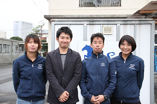 左から成瀬永美厩務員、小堺翔太さん、佐藤博紀調教師、佐藤里美厩務員
