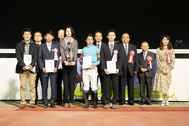 勝ったヤマニンアンプリメの長谷川浩大調教師は、今年3月の厩舎開業。ヤマニンアンプリメは2月で定年引退となった中村均調教師から引き継いだ。転厩初戦となった高知・黒船賞JpnⅢがアタマ差2着、名古屋・かきつばた記念JpnⅢでは1番人気に支持されるも2着と惜しい競馬が続いていた。今回は早めに函館競馬場に入っての調整。再度の1番人気にこたえる形で厩舎に初タイトルをもたらした。「ここ2戦、2着に負けていたので、まずホッとしました。年明け、中村先生のときから、今年は浦和のJBCを目標にやってきたので、なんとか出走していい競馬ができるように目指していきたいと思います」とのこと。