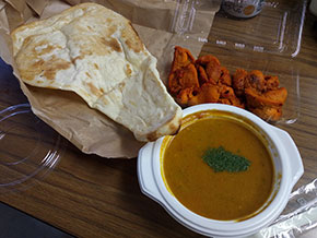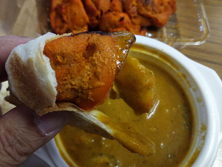大きいナンを少しずつちぎってカレーに浸し、付け合わせとして注文したスパイシーなチキンティッカを一緒に食べたら、かなり高い満足度。カレーの器の底には豆やトマトなどが沈んでいて、手間をかけて作られていることもわかりました。