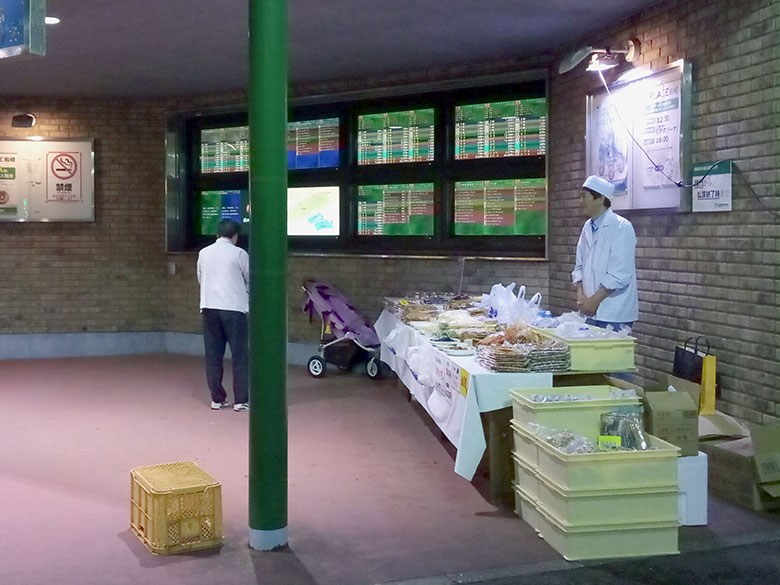 船橋競馬場の入口からスタンドに向かう途中、当日の結果一覧が表示されている場所があります。そこには屋根があって、壁際に漬物が並ぶ台も設置されています。