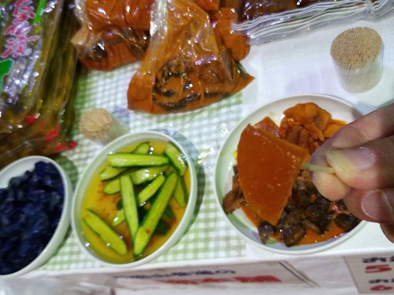 試食コーナーにある濃いオレンジ色に染まった大根に楊枝を刺して口に運ぶと、おお、これはゴハンが進む塩辛さ!