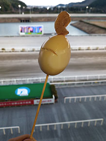 さっそく、丸いおでん缶のなかから「すじ」と「たまご」と「ごぼう」を選択。パドックを眺めながら、まずは「すじ」からいただきましょう。