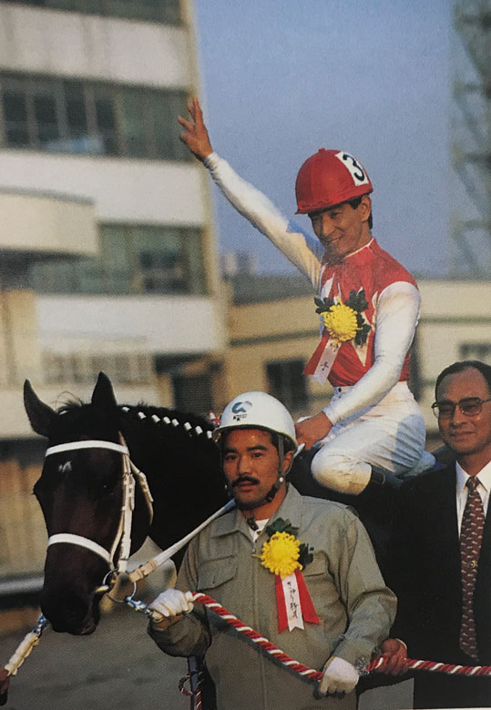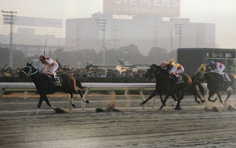 色々聞いているうちに、最初中央の阿部新生厩舎に入ったが、そこで厩務員を何人か病院送りにして、牧場に返されたところを川崎の佐々木国廣調教師に預かってもらうことになったらしい。担当は池田孝厩務員(現調教師)。ほとんどブレーキングも出来ていない状態で、いきなり小向(厩舎)に入れるのは危険、ということで、多摩の米軍キャンプにある乗馬クラブに預かってもらい、池田厩務員が通って馴致を一からやり直したそうだ。
