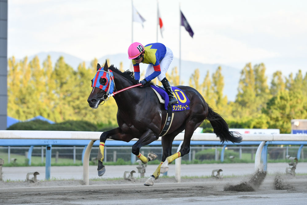 そうなると、実績的に劣勢といえる馬たちが徐々に離されていったのは仕方ないところで、3コーナーからは人気3頭の勝負。しかし、粘り込みを狙うハクサンウェーブの外から上昇してきたタンクティーエーの勢いは、遠目からでも明らかに上回っていた。そして最後の直線は独走。2着には7馬身もの差がついた。