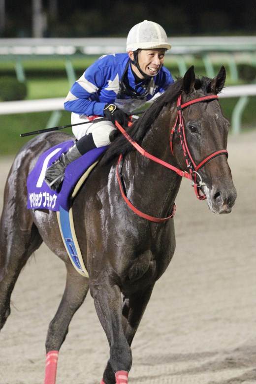 盛岡ダート2000メートルはスピードとスタミナが要求されるタフなコース。予想されたとおりパンプキンズの逃げ。ラップは、13.0-12.2-13.2-14.2-13.4-12.9-12.7-12.1-12.0-14.2で、前半3ハロン38秒4、後半3ハロン38秒3のスローペース。1コーナーで一気にペースダウンし、その後は淡々と流れて3コーナーすぎにペースアップ。2番手を追走していたニューホープがパンプキンズとの差を詰めにかかる。先頭から7~8馬身の差があったヤマショウブラックはかなりズブく、エンジンがかかったのは4コーナー手前。直線では一完歩ずつグイグイと力強く伸びると、単独先頭に立っていたニューホープをとらえて勝利。高松亮騎手は引き上げてくるなり、大きな声で「負けと思った」を連呼したが、きっちりハナ差で勝っていたことは、乗っていてわかっていた様子。馬を降りるとすぐに小林俊彦調教師とうれしさが伝わってくる握手をして後検量へ。