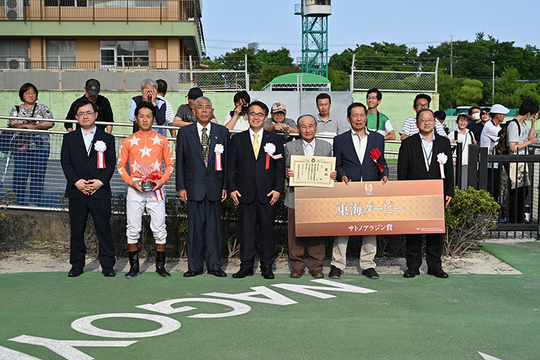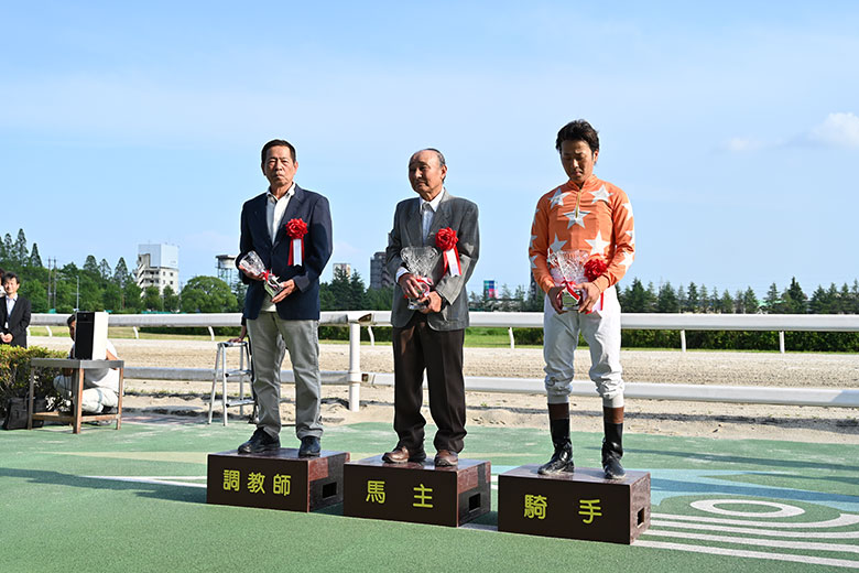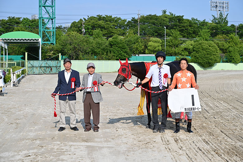 「いや~、ホッとしたよ」と何度も安堵の表情を浮かべたのは竹下直人調教師。「一時期は調子を崩していたけど、立ち直ってくれました。あの時、思い切って休んだのが良かったですね」と、1月29日の梅桜賞から前走・駿蹄賞まで約3カ月あけたことを勝因のひとつに挙げた。今井騎手が「自厩舎で勝てたのが一番嬉しいですし、デビューからお世話になっているオーナーの馬で勝てて本当に良かったです」と喜ぶと、竹下調教師も「それが嬉しいね。こういうことはなかなかないと思うから」と笑った。また、森哲オーナーは「11連勝でダービー制覇っていうのがまた特別ですね」と目尻を下げた。