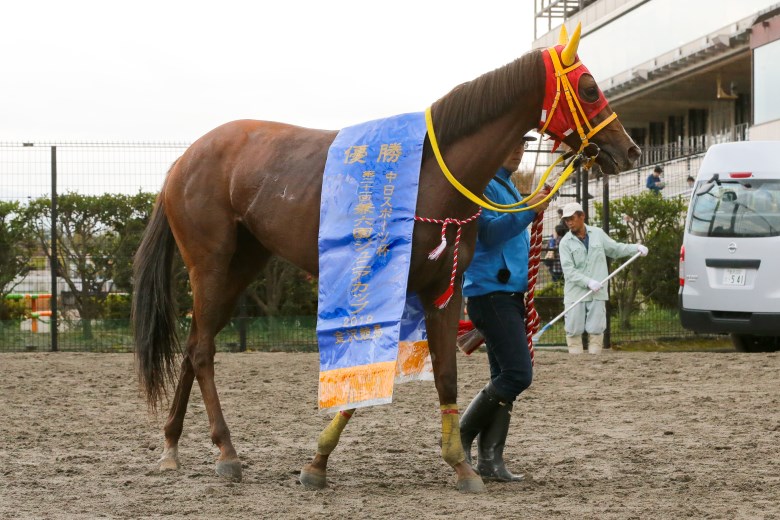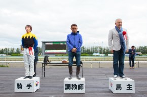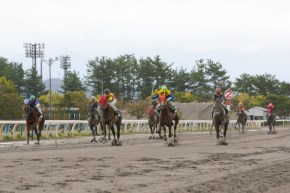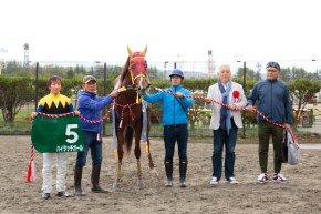 向正面に入ると、ストロングフーヴスが外から進出を開始。一方、ハイタッチガールは3コーナー手前で早くもムチが入った。4コーナーでも鞍上・青柳正義騎手の手は激しく動いていたが、外に切り替えると一歩一歩伸びて1馬身半差で勝利。2着は中団から泥んこになって差してきたフジヤマブシ。鞍上の平瀬城久騎手は「直線は手応えが良かったです。これからもっとレースを覚えてくれればと思います」と話した。クビ差の3着はストロングフーヴスで、「併せた方がいい馬なので」と畑中信司騎手は直線で勝ち馬に馬体を寄せに行ったが、すでに脚いろが違った。