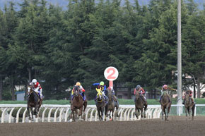 向正面では前で5頭が一団。そこから2頭が脱落し、3コーナーからは人気上位3頭の争いとなった。