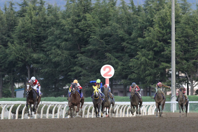 一方、あやめ賞で惜しくもクビ差2着だったボルドープラージュはダッシュがつかず。8頭立ての7番枠ゆえ一旦外に持ち出し、最初の4コーナーではほとんど最後方という位置取りになってしまった。「砂を入れ替えてから1600メートルのスタートは特に滑るようになって出遅れました」と山本聡哉騎手。それでもスタンド前の直線で徐々に位置取りを上げ、1、2コーナーを回るところでは3番手の外まで進出した。