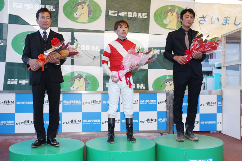 勝ったグローリアスライブは、デビューした門別では牡馬相手の2歳重賞で4着が2度。川崎移籍後、南関東では3歳特別戦を中心に5戦してすべて3着以内に好走しているものの、勝ち星はひとつだけ。「川崎でも1600メートルを走っていて、道営で右回りを経験していますので、たぶん(水沢1600メートルも)合うのではないかと話し合って決めました」と高月賢一調教師。相手関係にも恵まれ、そのプランが見事に当たった。高月調教師は2012年のこのレースでもミスシナノに初タイトルをもたらしており、その経験も生きたのだろう。