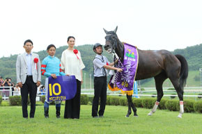 長距離輸送で少しイレ込んでいて、ゲートも不安だったんですけど、うまく展開もハマってくれたと思います。一戦一戦力をつけて、馬体もよくなっていますし、走り方でもパワーをつけている印象です。菜七子ちゃんが勝つ予定だったんですけど、じゃましてしまってすいませんでした(笑)。
