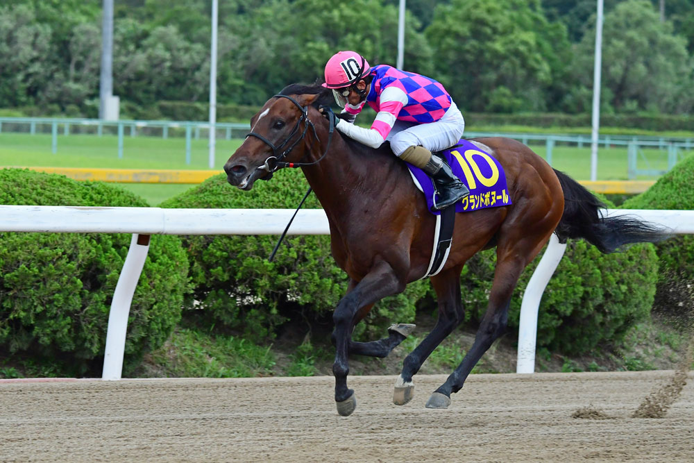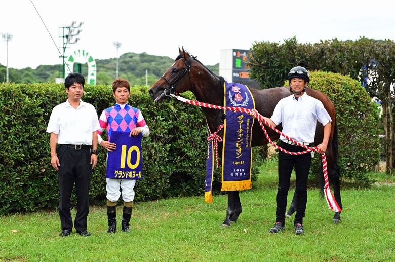 グランドボヌールはこれまで芝路線を進み、4走前に準オープン特別を勝つと、ここ2戦はCBC賞GⅢ・6着、中京記念GⅢ・5着と健闘。ダートグレード初挑戦とはいえ、JRA勢5頭の中では重賞での実績は最上位だった。ダートは3歳1月に2戦していずれも大敗。それ以来の出走だったが、管理する鈴木孝志調教師は「ダートは前々からどこかで試したかったので全然心配していなかった」とのこと。JRAでは全5勝中、左回りの中京と東京で計4勝しており、むしろ今回はダートよりも右回りが心配だったそう。「1200では忙しく、1600では最後止まってしまうので、1400メートルにこだわっていきたい」とのことで、次走はテレ玉杯オーバルスプリントJpnⅢ(9月12日、浦和)を予定。出走が叶えば、左回り・1400メートルのベストの条件で、真価を発揮することになりそうだ。