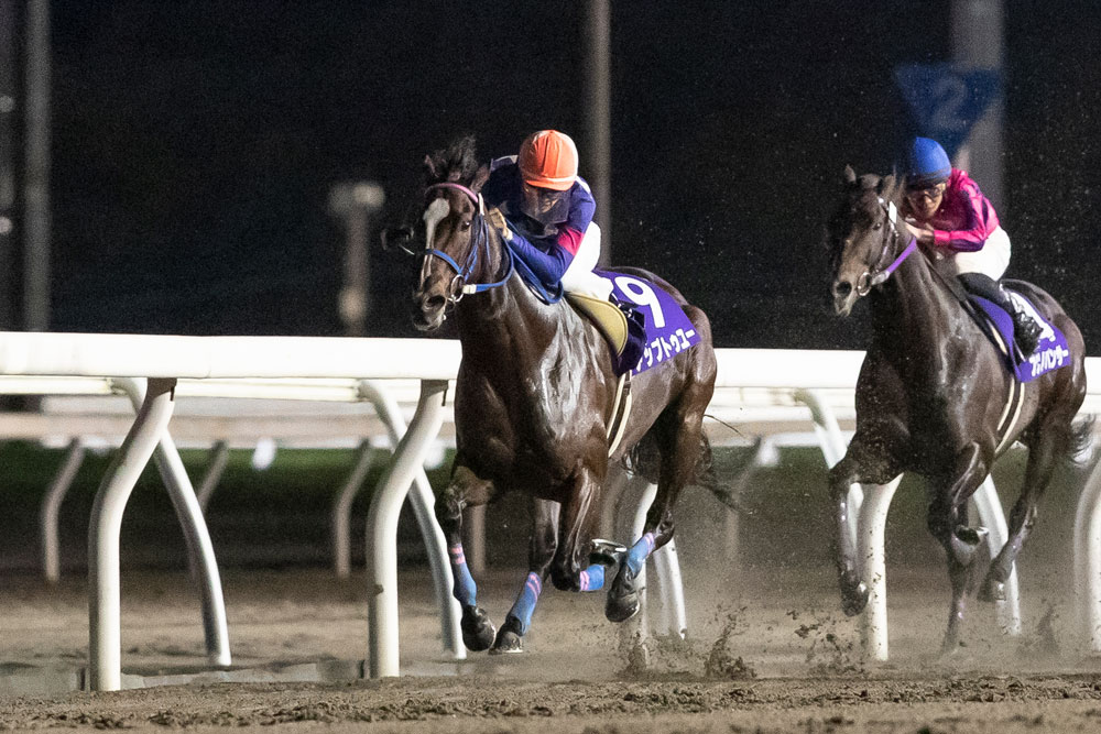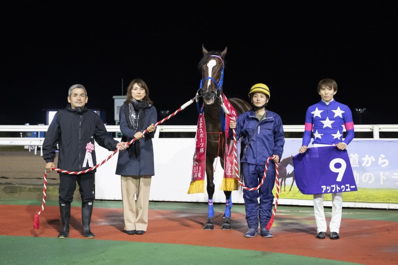 そのスタート。最も速かったのがアップトゥユーだった。内からフジノパンサーの出方を窺い、2番手の外を進んだ。スタートを決めたことで、阿部騎手のプラン通りに事が進む。3コーナーまでは団子状態で進んでいたが、不良馬場もあって前半3ハロンのペースは、12.3-10.4-11.8=34.5と速かった。コーナー地点のラップは12.0と少し緩むが、ここで早め先頭に立ったアップトゥユーの戦略は、まさにハマった。メイショウアイアンとソルサリエンテの追撃を振り切り、2016年ローレル賞以来、2年11カ月ぶりの重賞制覇となった。最後の1ハロンは13.0を要したように、最後の力を振り絞った勝利には、角川秀樹調教師も格別な思いを持った。