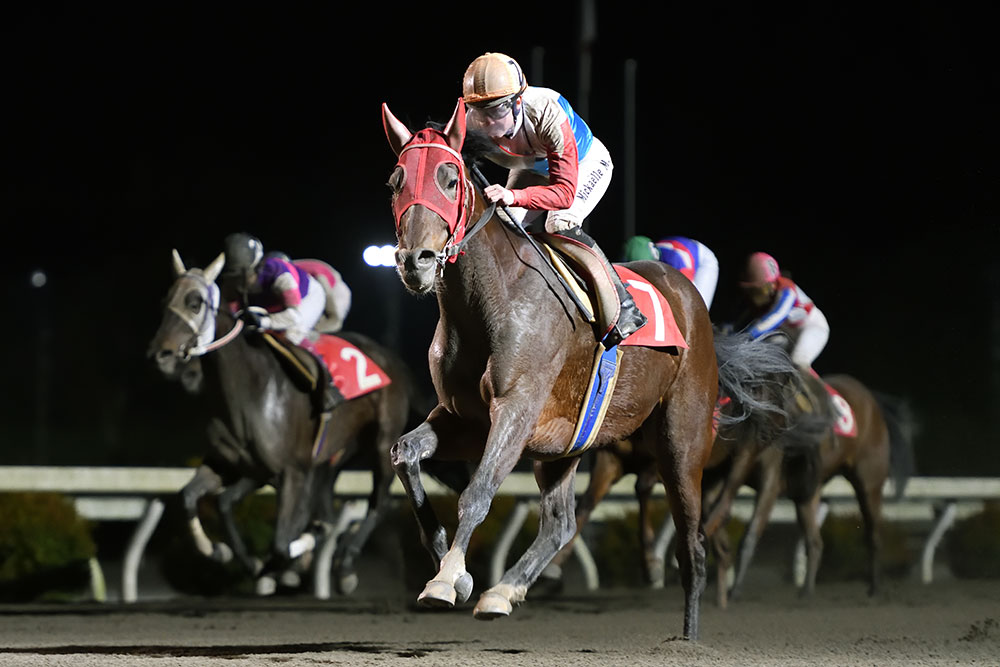 第1戦は好スタートを切った林謙佑騎手に対し、外から関本騎手が「引っ掛かってしまいました……」と馬体をピタリと併せ、前がやや飛ばす展開。そうなると、後方で脚を溜めていた馬にとってはもってこいで、後方馬群にいたミツルファミリーと畑中信司騎手が3~4コーナーでまくって直線抜け出した。