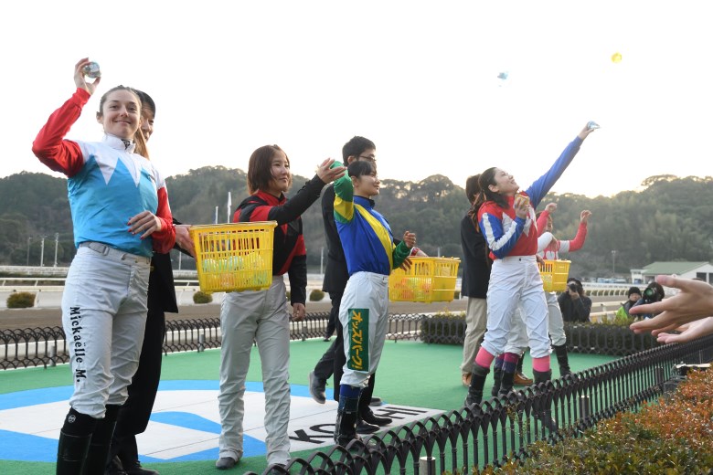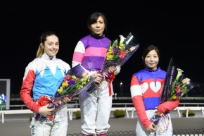 2戦の結果、高知ラウンドの優勝は3、2着と上位でまとめた宮下騎手。日本の女性騎手最多勝利記録保持者とあって貫録を見せた。2位は第2戦を勝ったミシェル騎手、3位は木之前騎手だった。関本騎手は6位での発進となったものの、ハニカんだ様子。というのも、ミシェル騎手が「将来性ナンバーワン!」と指名したからだ。その理由は「バランスが取れているし、落ち着いて乗っていた」とのこと。それに対し本人は「緊張していないように見えるそうですが、毎回、その日の1レース目は緊張しています」とのこと。言葉の壁がありながらも「いろんな話をしましたし、フィーリングも合いました」とミシェル騎手が話すように日本人騎手とミシェル騎手は交流を深めた。