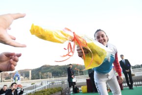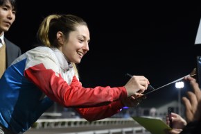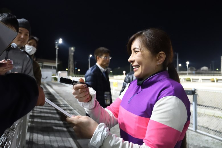 多くのファンの視線を集めたミシェル騎手はもちろんこの日が初の高知。「カーブがすごい」と、騎乗経験のあるJRA札幌競馬場や川崎競馬場、大井競馬場との違いを感じたようだ。