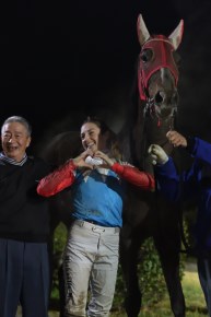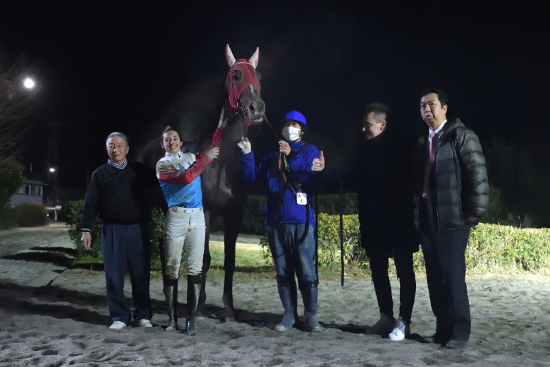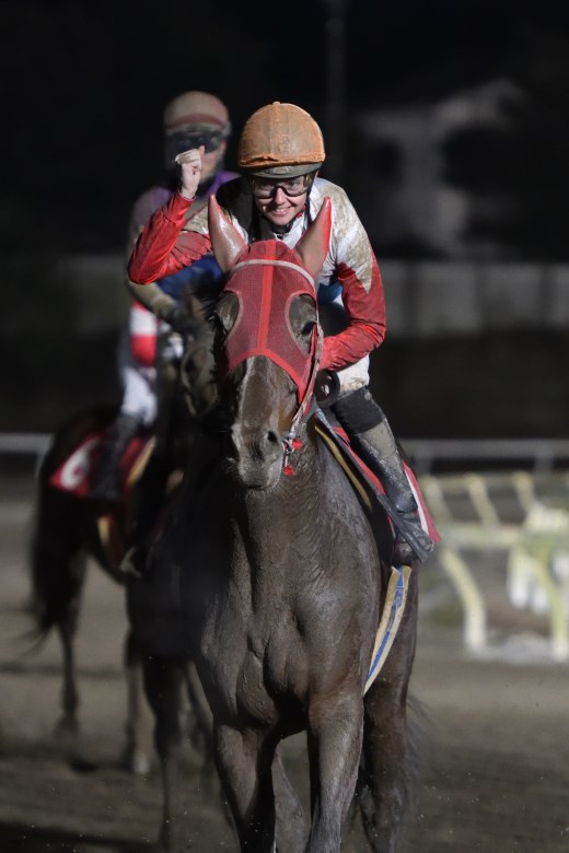 2戦目は後方からの馬と聞いていたので、ゲートを速く出てくれて嬉しかったです。4コーナーで「これは行ける」と思い、外側を走るといいとアドバイスをいただいていたので、直線では外を通りました。勝利に導けてとても嬉しいです。これからもっと勝って声援に応えたいです。アリガトウゴザイマス。