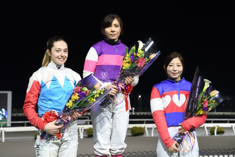 女性最先着は後方3番手から4コーナーをロスなく回り、ゴール寸前でグイッと伸びた宮下騎手で3着。一方、4コーナーで「出口が見当たりませんでした」と悔やんだのは女性5位での入線(8着)となった濱騎手。また女性2位入線(5着)の岩永騎手は4番手からレースを進めたが「ハナに行けたらと思ったのですが、ゲートを出せず悔しいです」と唇を噛んだ。