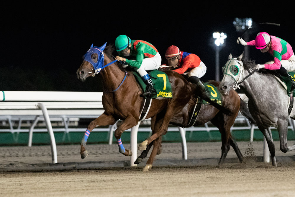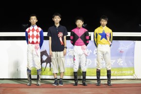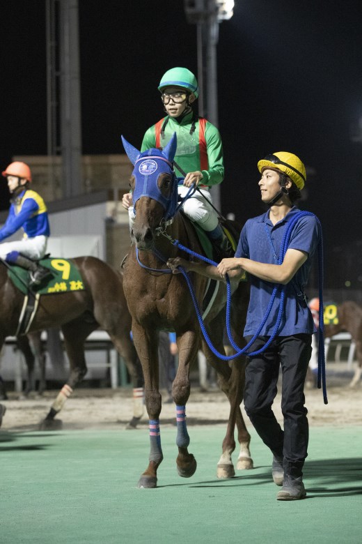 前は見るからにハイペース。3番手の内から直線で外に持ち出した木幡育也騎手(JRA)が前をとらえにかかり、連れて野中悠太郎騎手(JRA)も伸びてきた。さらにスタートでダッシュがつかなかった地元の山本咲希到騎手が大外から徐々に位置取りを上げてこの2頭に迫り、残り100メートルからは3頭の追い比べ。ゴール前でぐいっと伸びた野中騎手が勝利。半馬身差で山本騎手、クビ差3着に木幡騎手で、人気上位3頭での決着となった。