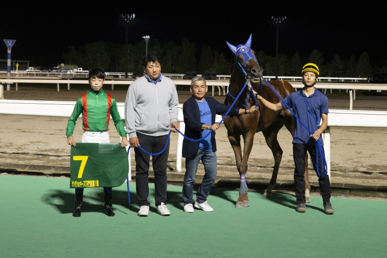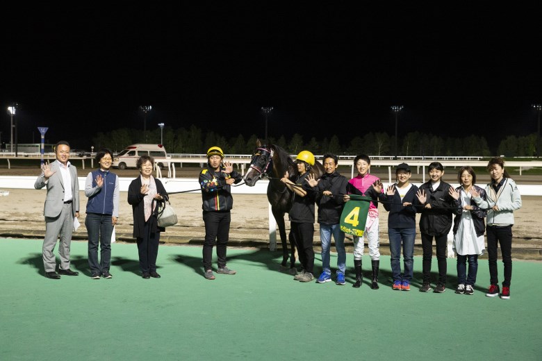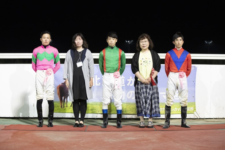 「(1日5勝は)自分でも驚いているんですけど、うれしいです」という小野騎手は、父が牧場で働いているという、ここ日高の出身。応援に来ていた家族と一緒に1日5勝という快挙の口取りに収まった。
