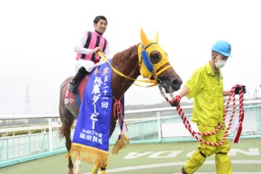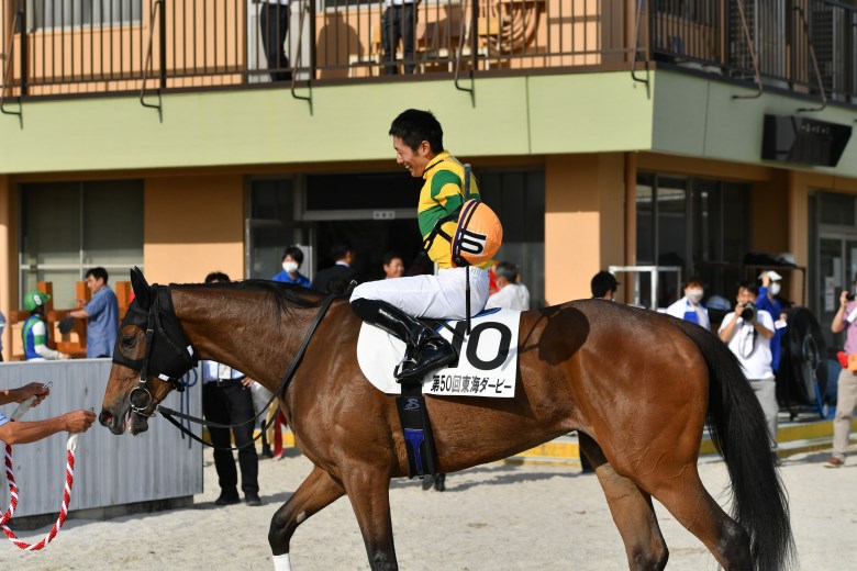 逃げたディアタイザン、ぴたりと2番手のステラモナークが、向正面半ばから3番手以下を離しての一騎打ちは、7番人気のディアタイザンが、1番人気ステラモナークを半馬身差で振り切った。枠順の内外、急に強く降り出した雨の重馬場、距離延長など、さまざまなことがディアタイザンに味方したと思われるが、迷わず逃げてレースを支配した杉浦健太騎手の好騎乗も光った。今年でデビュー11年目の杉浦騎手は、昨年85勝、兵庫リーディング6位は、ともにキャリアハイ。“ダービージョッキー”となってさらに存在感を増している。