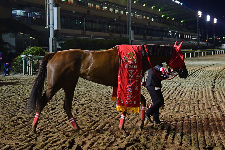 2002年東京プリンセス賞の覇者サルサクイーンの愛娘としても知られるサルサディオーネ。管理する堀千亜樹調教師、矢野騎手とも念願のダートグレード初制覇となった。ダートグレードで地元馬が優勝するシーンは、地方競馬ファンの醍醐味のひとつでもあるが、無観客競馬というのは何とも寂しい。それでもマリーンカップJpnⅢの売得金額はレコード更新となった。