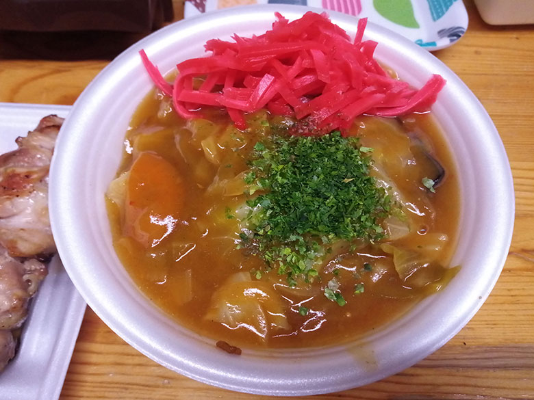 それはともかく、あんかけ焼きそばには野菜がたっぷり。いつの頃からかカレーの香りが加わりましたが、ボリューム感があるのは相変わらずですね。これがまた、昭和の競馬場フードという感じがするんですよ!