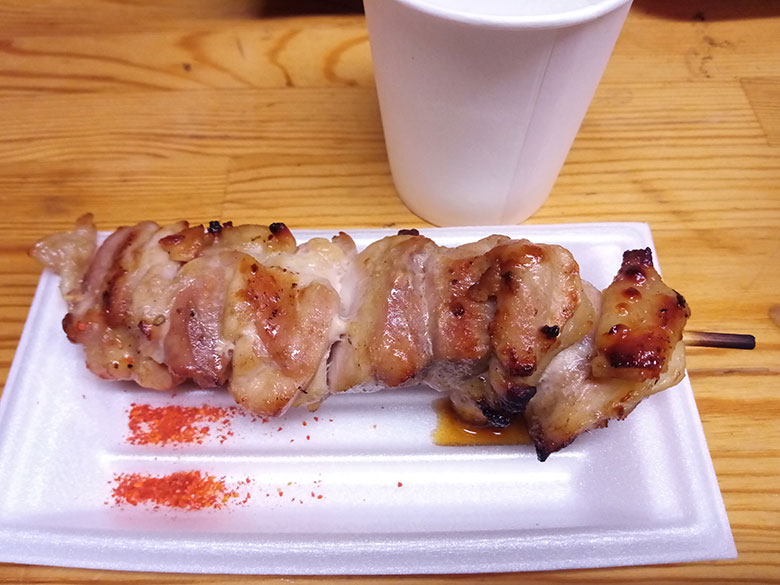 カウンターでドンブリを受け取って、割りばしの横に置いてある青のりと紅ショウガをどっさりと乗せ、確保しておいた自分の席に戻って写真撮影。同時に注文した焼き鳥はけっこうな大きさで、3階スタンドのゴール寄りにはその香りが漂っています。