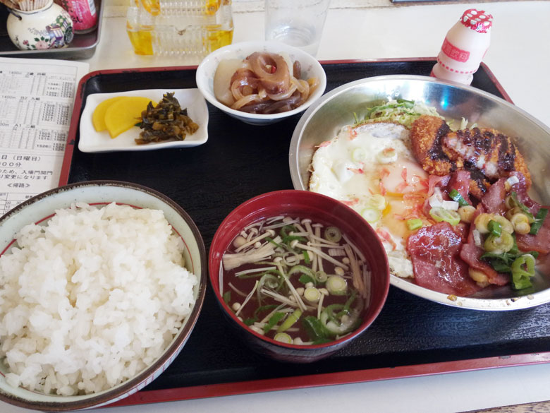 ということで今回は、再開したらまた注文したいと思うメニューについてご紹介。金沢競馬場の食堂街にある「世界館」の「目玉焼き定食」です。