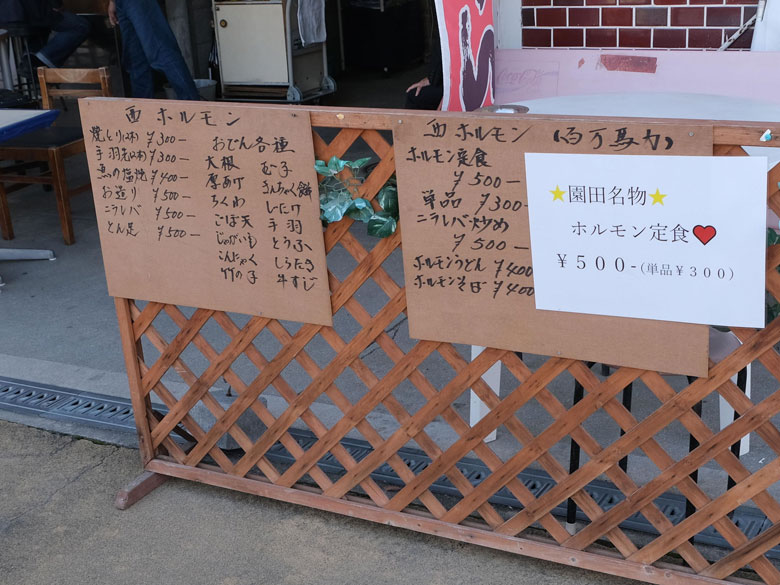 さて何にしようかなと、お店の前をカニ歩きしながら見ていくと、おお「ホルモンそば」なるものがあるじゃない。ホルモンが入った蕎麦は浦和競馬場のものを紹介したことがあるけれど、関東と関西を比較できるし面白そう!