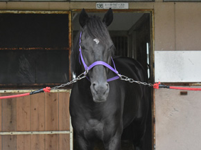 到着した時の様子を教養センター養成課の中嶋遼さんに伺ったところ、「こんなに大人しい仔は見たことがない」と、馬運車の運転手さんも言っていたほどかなり落ち着き払っていたそうで、その後の引き馬でも従順にスタスタと歩いていたそうです。