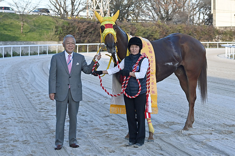 笠松競馬場の知名度アップに大きく貢献した名馬は引退後にレース名になり、今年はそのオーナーの所有馬であるラジアントエンティが出走。そしてオーナー自身も笠松に来場した。