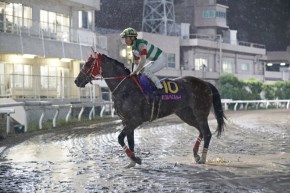 前残りの傾向が出ていた不良馬場のなか、7番手を進んだマルシュロレーヌ。徐々に先団との差を詰め3コーナー過ぎから一気に加速すると、直線の外を鋭く伸び、先に抜け出したマドラスチェックをあっさりかわした。初コース、初ナイターをものともしない走りで、勇躍この路線の主役に躍り出た。