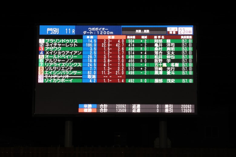 3コーナーから4コーナーの4ハロン目も11.9とペースを緩めず、厳しい展開を作ったオールドベイリーはさすがに苦しくなり、最後の2ハロンは12.5-13.9と一気にバテた。先に抜け出したソルサリエンテ、大外から追い込むメイショウアイアン、さらにその間からソイカウボーイが迫るゴール直前の大接戦は、まさに手に汗握る激闘だった。